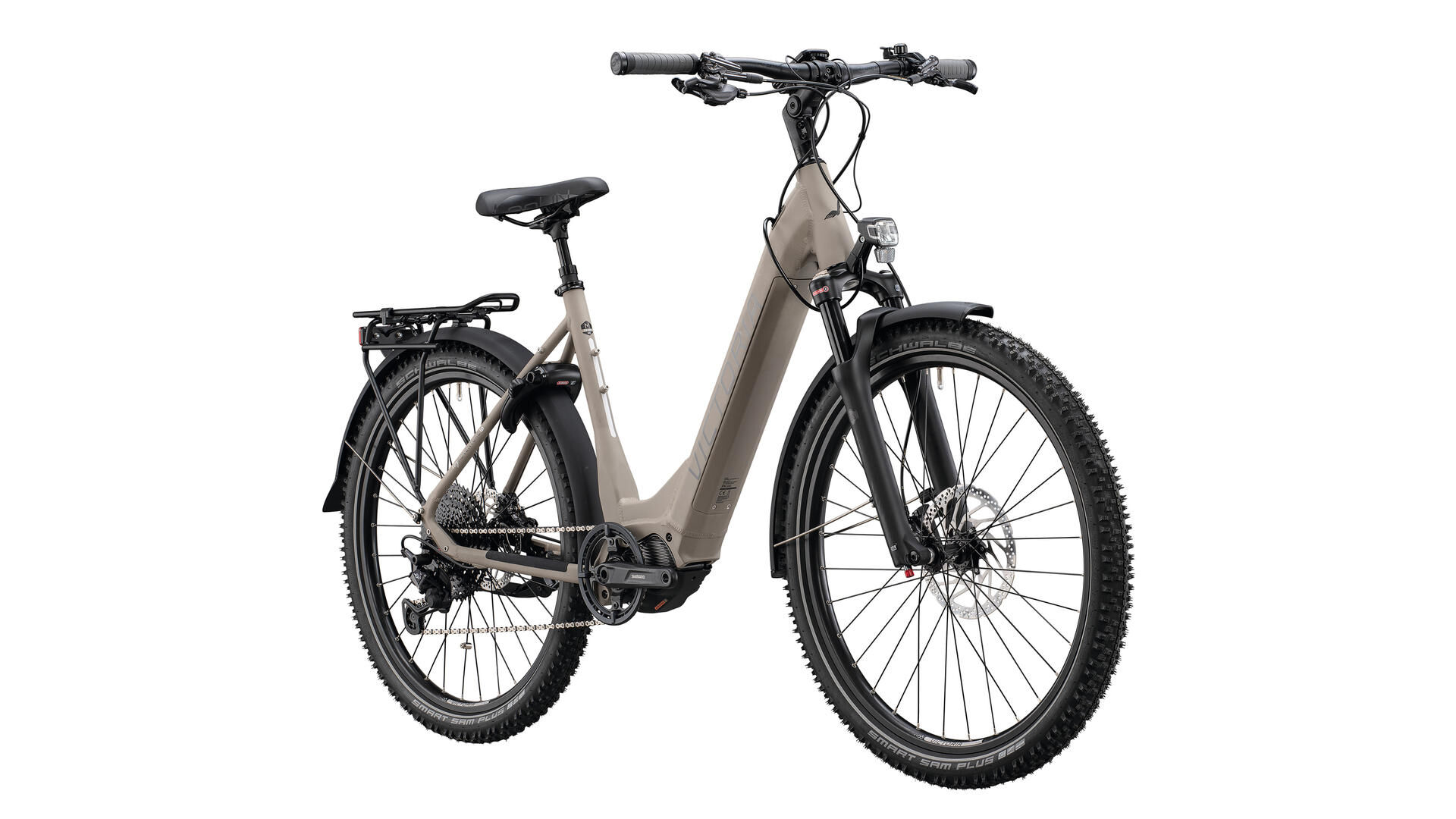 | Équipement: | fourche suspendue, tige de selle suspendue, porte-bagage, pare-chaîne, aide électronique à la poussée, garde-boues |
